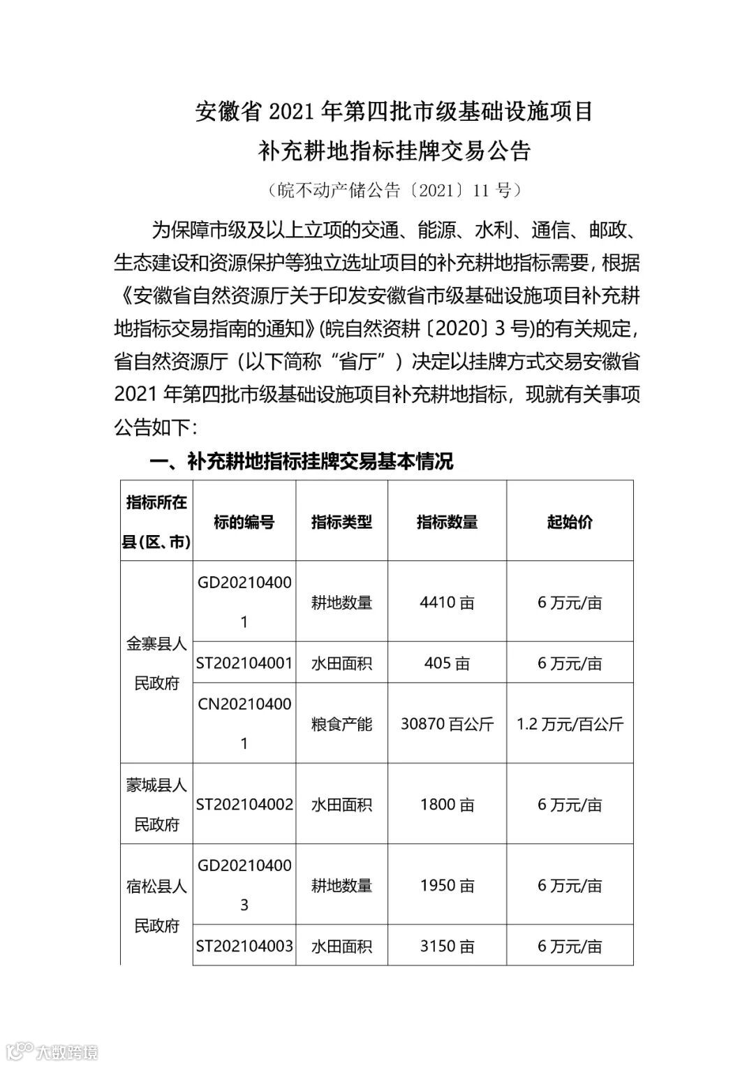 导读:安徽省2021年第四批市级基础设施项目补充耕地指标挂牌交易公告.pdf