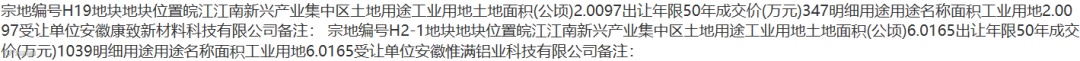 池州市皖江江南新兴产业集中区H19号地块使用权由安徽惟满铝业科技有限公司竞得,规划用途为工业用地。