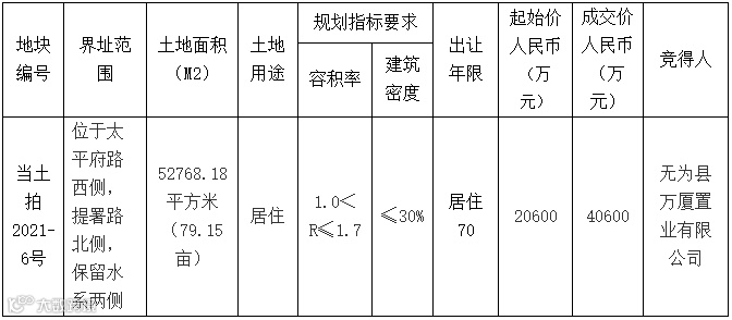 当涂县太平府路西侧,提署路北侧,保留水系两侧当土拍2021-6号地块使用权由无为县万厦置业有限公司竞得,规划用途为居住用地。