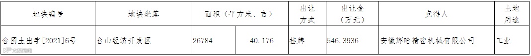 马鞍山市含山经济开发区含国土出字[2021]6号地块使用权由安徽辉晗精密机械有限公司竞得,规划用途为工业用地。