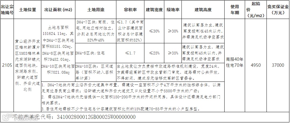 黄山市将挂牌出让经济开发区梅林新潭片区XM03梅林单元东湖轩辕大道西侧、东湖路东侧、齐云大道北侧2105号地块使用权,规划用途包括商服、住宅,申请人须于6月7日前提交报名资料。