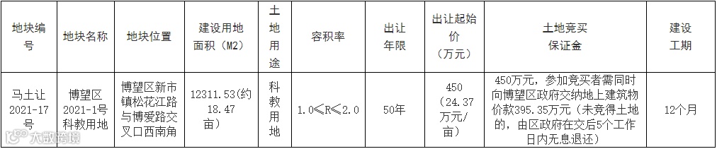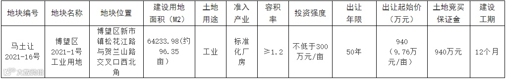 马鞍山市将挂牌出让博望区新市镇1宗科教用地、1宗工业用地使用权,申请截止日期都为6月9日。