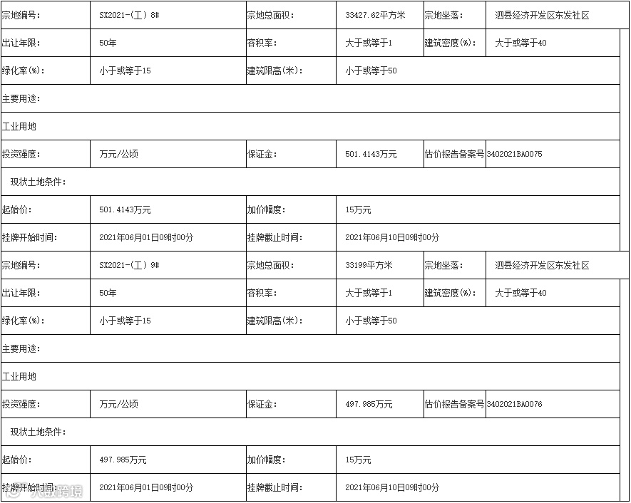宿州市5宗土地使用权将出让,泗县2宗工业用地申请截止日期为6月8日,灵璧县3宗商业住宅用地申请截止日期为6月2日。