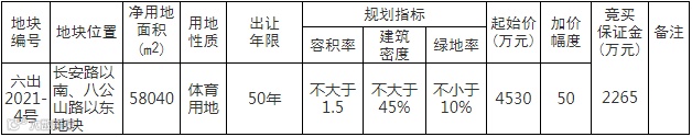 长安路以南、八公山路以东六出2021-4号地块为体育用地,申请人可于5月29日到6月7日进行网上报名及上传相关附件。