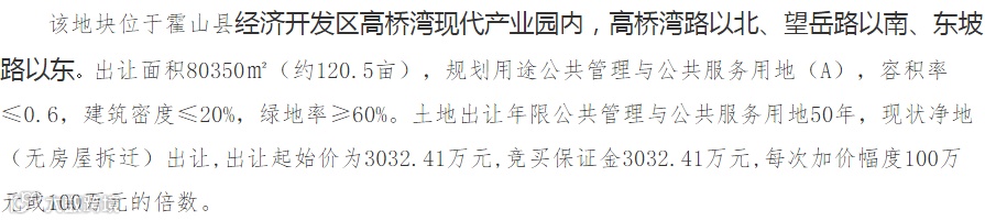 六安市2宗土地使用权将出让。霍山县经济开发区高桥湾现代产业园内,高桥湾路以北、望岳路以南、东坡路以东C-2021-14地块为公共管理与公共服务用地(A),申请人提交报名资料时间为6月7日8时00分至9时00分。