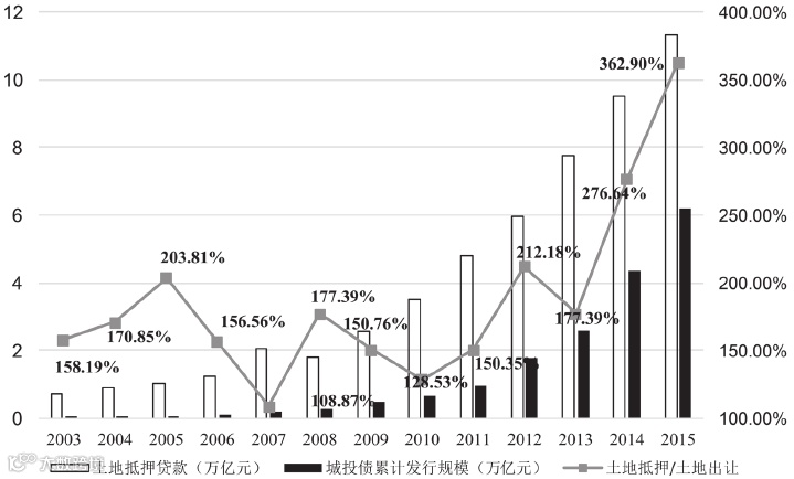 资料来源:土地抵押贷款和土地出让收入数据来源于《中国国土资源年鉴》,城投债数据来源于Wind。