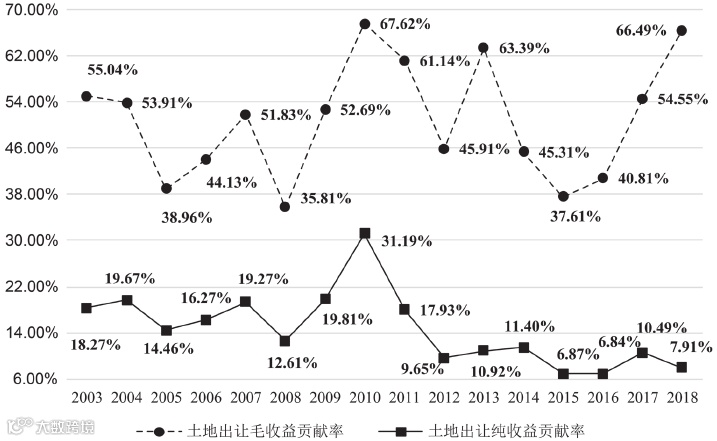 接下来的问题是,在扣除了土地出让成本后,土地出让对地方财政的贡献率为多少?图3展示了土地出让毛收入贡献率(土地出让毛收入/地方财政一般预算收入)和土地出让净收入贡献率(土地出让净收入/地方财政一般预算收入)的逐年变化趋势。