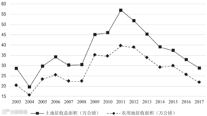 图2显示,农用地和总的土地征收规模在2011年之前处于上升区间,但在2011年后呈逐年加速下滑的态势,这恰好是土地出让成本开始飘升的年份(参见图1)。迅速缩小的征地规模表明,未来国有土地的出让规模将大幅缩减,利用土地财政进行创收的空间将被进一步压缩。