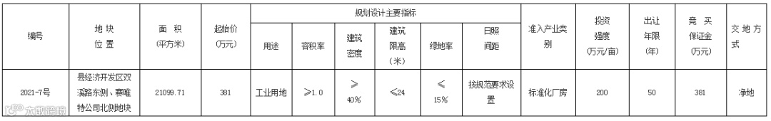 池州市青阳县将出让位于县经济开发区双溪路东侧、赛唯特公司北侧的2021-7号地块使用权,该地块规划用途为工业用地,使用权出让年限为50年。