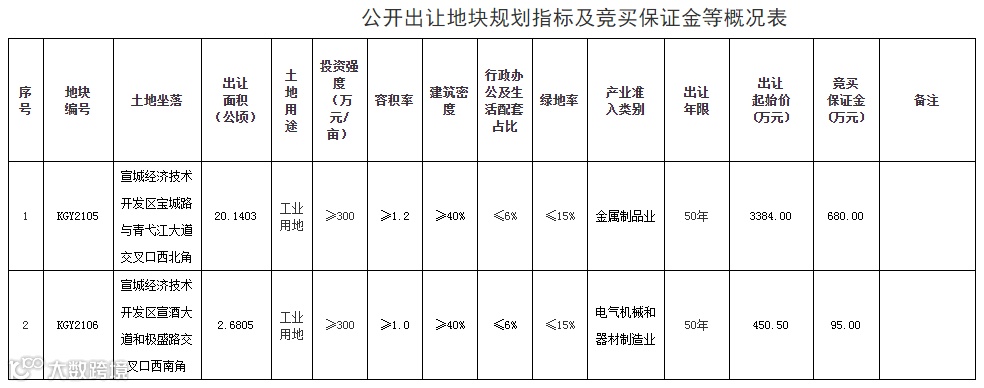 宣城市经开区KGY2105号地块和KGY2106号地块使用权将挂牌出让,规划用途均为工业用地,使用权出让年限50年。