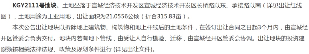 宣城市经开区将出让长桥路以东、承接路以南KGY2111号地块使用权,规划用途为工业用地,申请人可于4月30日到5月19日下载出让文本,交纳竞买保证金后,在线提出竞买申请。