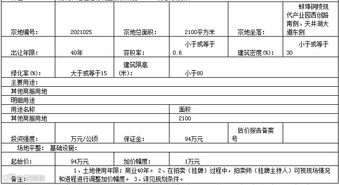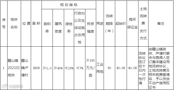 芜湖市2宗土地使用权将出让。南陵县籍山镇卢塘村籍山镇202101地块为工业用地,申请期限为4月30日到5月19日。