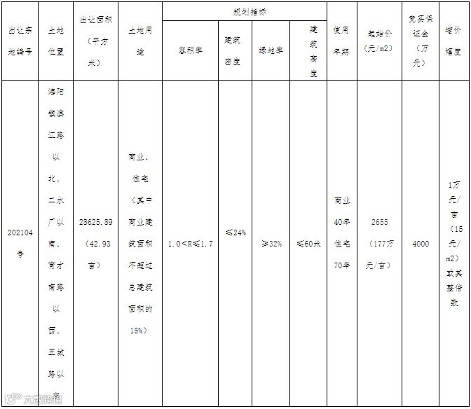 黄山市休宁县将挂牌出让海阳镇滨江路以北、二水厂以南、育才南路以西、五城路以东202104号地块使用权,规划用途为商业、住宅(其中商业建筑面积不超过总建筑面积的15%)用地。申请人可于5月31日前提交书面报名材料进行资格预审。