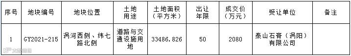 市涡阳县涡河西侧、纬七路北侧GY2021-215号地块使用权由泰山石膏(涡阳)有限公司竞得,规划用途为道路与交通设施用地。