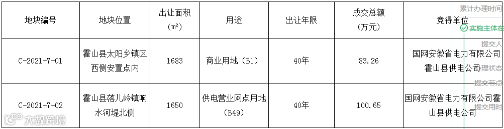 六安市霍山县2宗土地使用权由国网安徽省电力有限公司霍山县供电公司竞得,规划用途分别为商业用地和供电营业网点用地。
