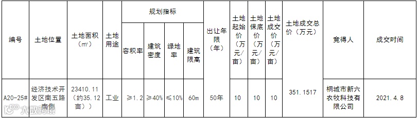 安庆市桐城市经济技术开发区南五路南侧A20-25#地块使用权由桐城市新六农牧科技有限公司竞得,规划用途为工业用地。
