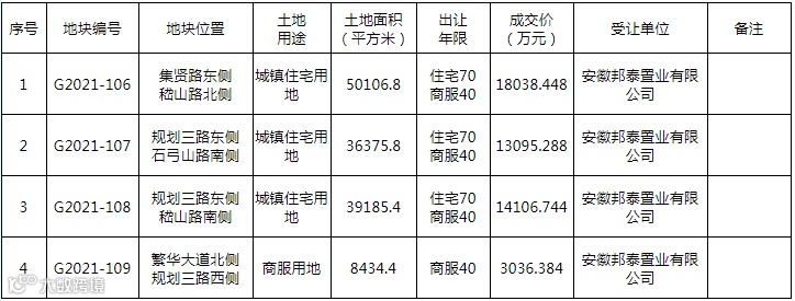 亳州市涡阳县4宗土地使用权由安徽邦泰置业有限公司竞得,其中3宗为城镇住宅用地,1宗为商服用地。