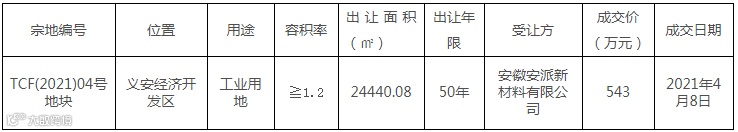 铜陵市义安经开区TCF(2021)04号地块使用权由安徽安派新材料有限公司竞得,规划用途为工业用地。