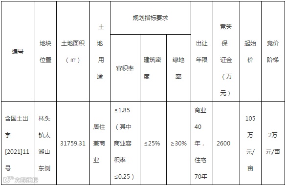 马鞍山市含山县将挂牌出让林头镇太湖山东侧含国土出字 [2021]11号地块使用权,规划用途为居住兼商业用地,申请人可于6月1日到6月30日提出书面申请。