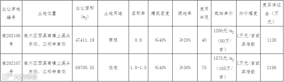 黄山市徽州区西溪南镇上溪头东侧、江祁寺南侧2宗地块使用权将要出让,规划用途分别为商服用地和住宅用地。