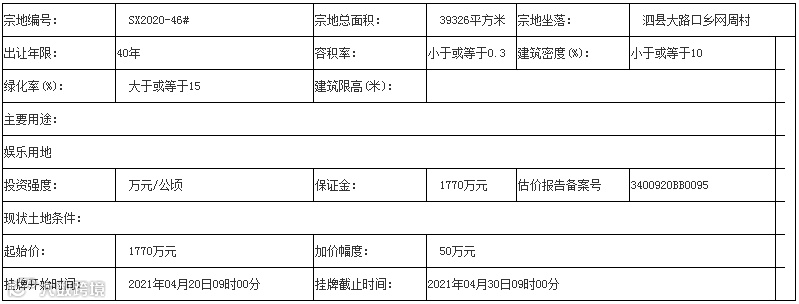 宿州市泗县决定挂牌出让大路口乡网周村SX2020-46#号土地使用权,规划用途为娱乐用地。