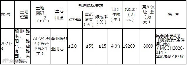 位于鲲鹏路南、三阳路北、嵇康路西、南华路东的2021-3号地块为商业服务业用地,提交书面申请截止日期为4月20日。
