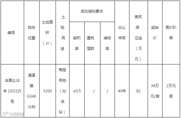 马鞍山市含山县将挂牌出让清溪镇G346北侧的含国土出字 [2021]5号地块使用权,规划用途为商服用地(加油站)。