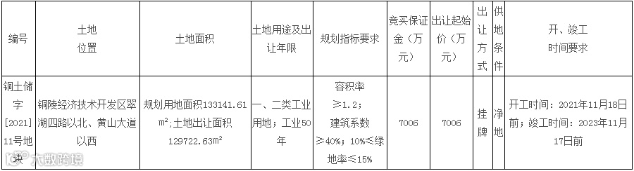 铜陵市将挂牌出让经济技术开发区翠湖四路以北、黄山大道以西铜土储字[2021]11号地块使用权,规划用途为一、二类工业用地,申请人可在4月22日到5月21日报名。