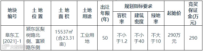 阜阳市将挂牌出让颍东区梨树路北侧、富颍路东侧阜东工[2021]-1号地块使用权,规划用途为工业用地。申请人可于5月17日到6月16日提交书面申请。