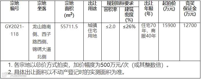 亳州市涡阳县将拍卖出让龙山路南侧、西子路西侧、锦绣大道北侧GY2021-118号地块使用权,规划用途为城镇住宅用地。申请人可于5月17日到6月8日提交书面申请。