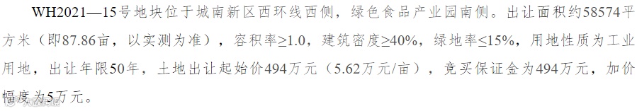 蚌埠市五河县将出让城南新区西环线西侧,绿色食品产业园南侧WH2021—15号地块使用权,规划用途为工业用地。有意者请于6月15日16时30分前提交书面申请,领取公开出让文件。