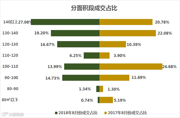 从分面积段成交来看,140㎡以上的房源成交占比27.08%,是销量最多的面积段,其次是130-140㎡的户型,占比19.20%。8月份高新区住宅市场以改善性需求为主。