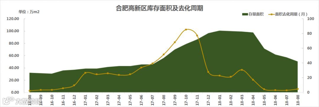 截止2018年8月31日,高新区的商品住宅可售量为3731套/50.62万㎡ ,库存面积环比下跌11.57%。去化周期为4.2个月,较7月份降低1.7个月(该数据以备案为准,不排除实际售出、在等备案的房源数据)。