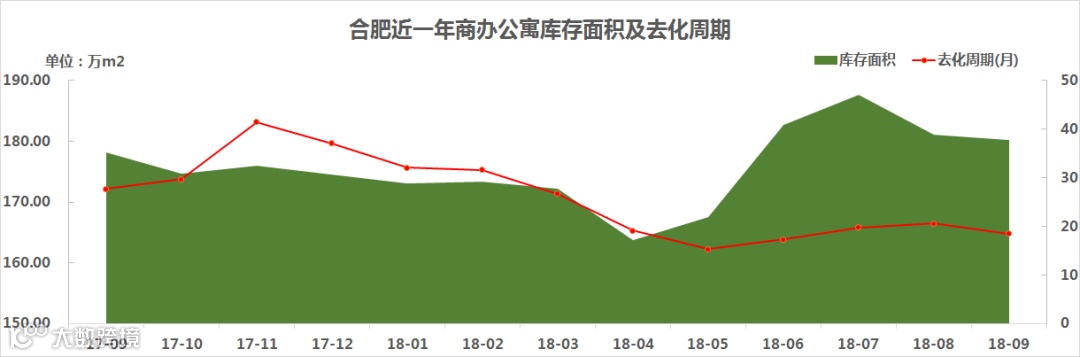 从合肥商办公寓整体库存面积情况来看,虽然目前库存面积较多,但去化周期也只有18.5月。