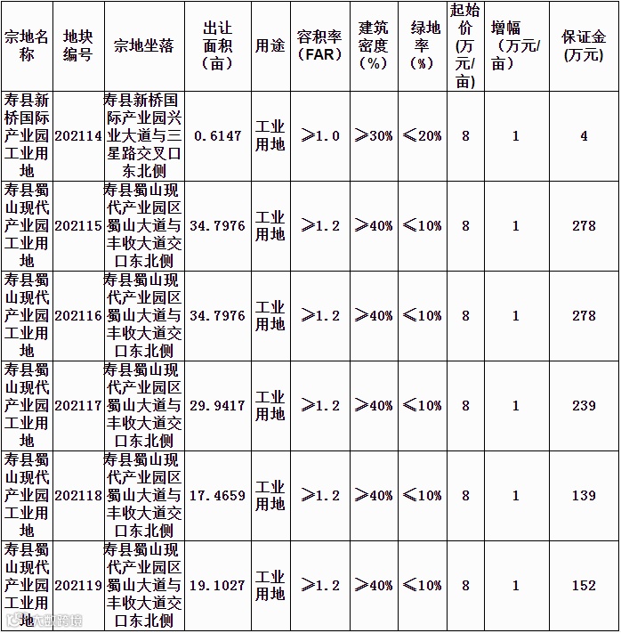 淮南市寿县将挂牌出让11宗土地使用权,其中10宗工业用地使用权竞买保证金缴纳截止时间为2021年5月25日,另1宗公用设施用地竞买保证金缴纳截止时间为2021年5月24日,竞买保证金缴纳时间以实际到达寿县公共资源交易中心帐户时间为准。