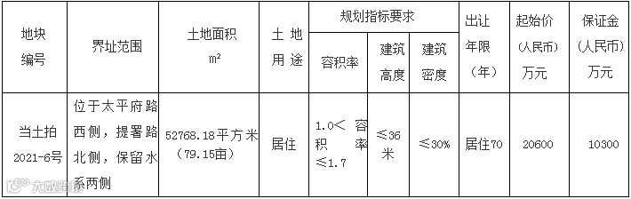 马鞍山市当涂县将拍卖出让太平府路西侧,提署路北侧,保留水系两侧当土拍2021-6号地块使用权,规划用途为居住用地。申请人可于4月23日到5月18日提交书面申请。