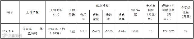 安庆市桐城市将挂牌出让范岗镇棋盘岭村F19-11#号地块使用权,规划用途为工业用地,申请人可于4月23日到5月21日获取挂牌出让文件。