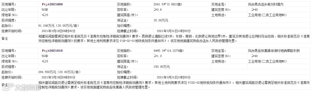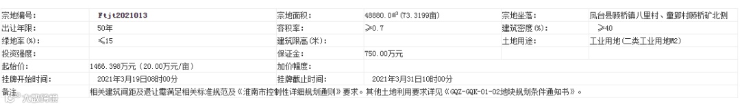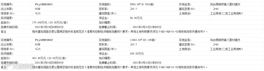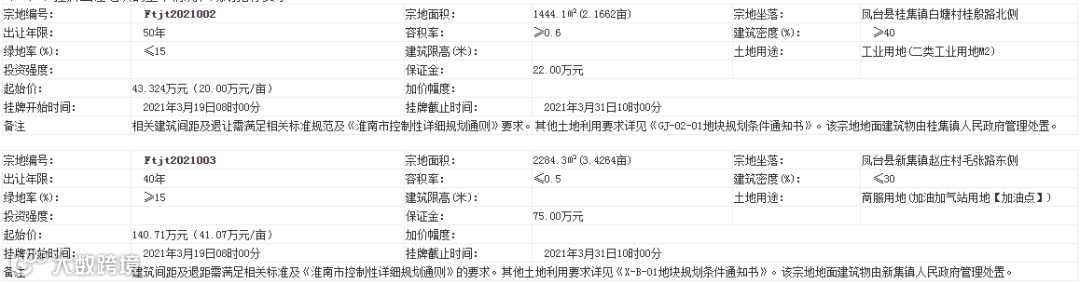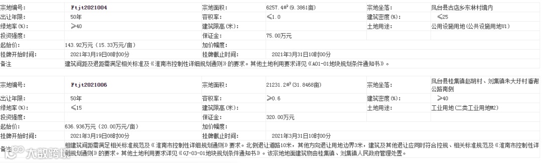 市公共资源交易中心消息,凤台县拟出让9宗土地使用权。9宗土地中,有7宗为工业用地,使用权出让年限为40年;1宗为商服用地,年限为40年;1宗为公共设施用地,年限为50年。