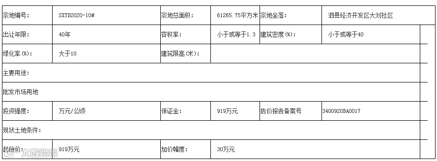 宿州市泗县自然资源和规划局决定通过拍卖方式出让泗县经济开发区大刘社区SXTD2020-10#号地块使用权,面积约61265.75㎡。