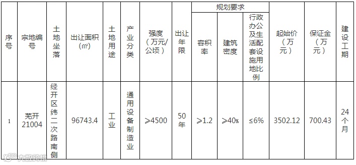 芜湖市自然资源和规划局决定以招拍挂方式出让经开区纬二次路南侧芜开21004号地块使用权。