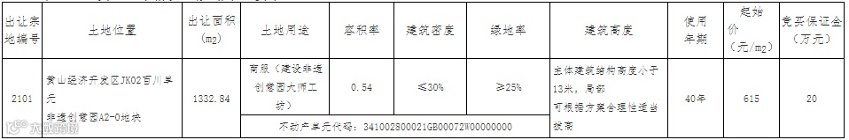 黄山市将通过挂牌方式出让黄山经济开发区JK02百川单元非遗创意园A2-0地块使用权,地块面积约1332.84㎡。