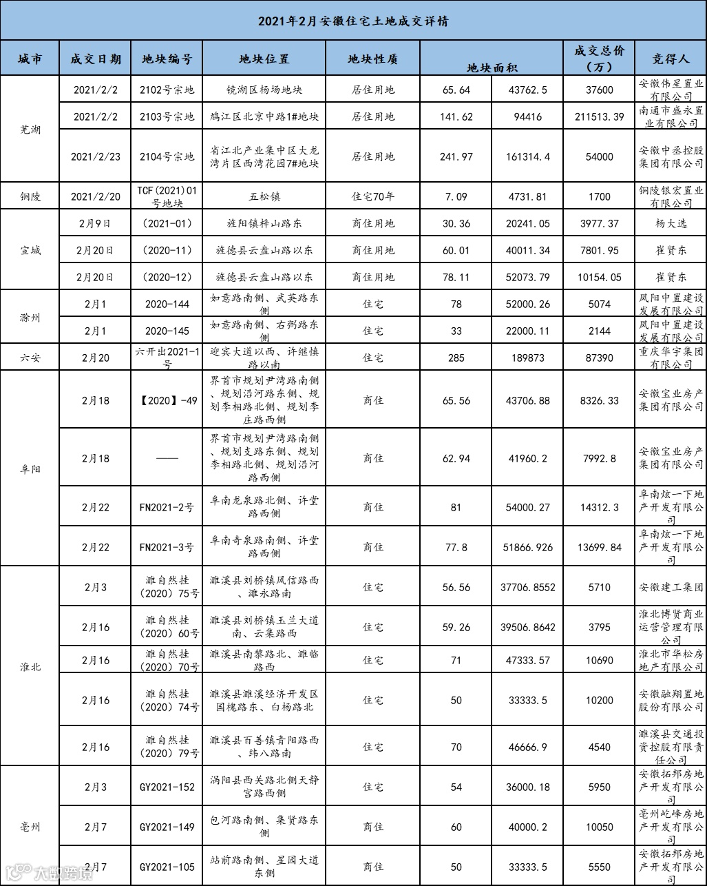 2月安徽住宅用地成交面积1778亩揽金超52亿元。