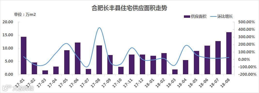 自2017年以来,长丰县的住宅一直保持较高的供应量。2018年1-8月份更是出现连续五个月住宅供应量的持续增长。