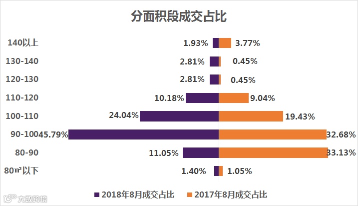 从分面积段成交来看,90-100㎡之间的房源成交占比45.79%,是绝对的主力销量户型。其次是100-110㎡以上的房源,占比24.04%。
