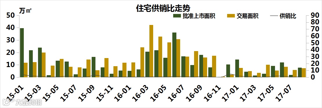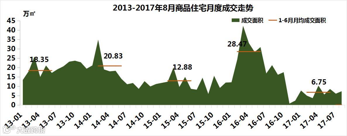 2、进入到2017年,成交量连续走低,今年8月份,长丰县共成交商品住宅708套/7.3万㎡,成交面积环比涨21.65%。