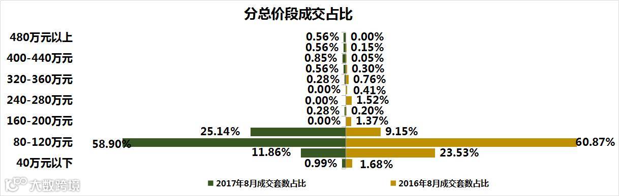 2、从分总价段来看,总价80-120万元的成交占比58.9%,比2016年8月减少了1.97%;总价40-80万元的成交占比11.86%,同比2016年8月占比减少了11.67%(8月长丰县的房价同比上涨24.04% )。