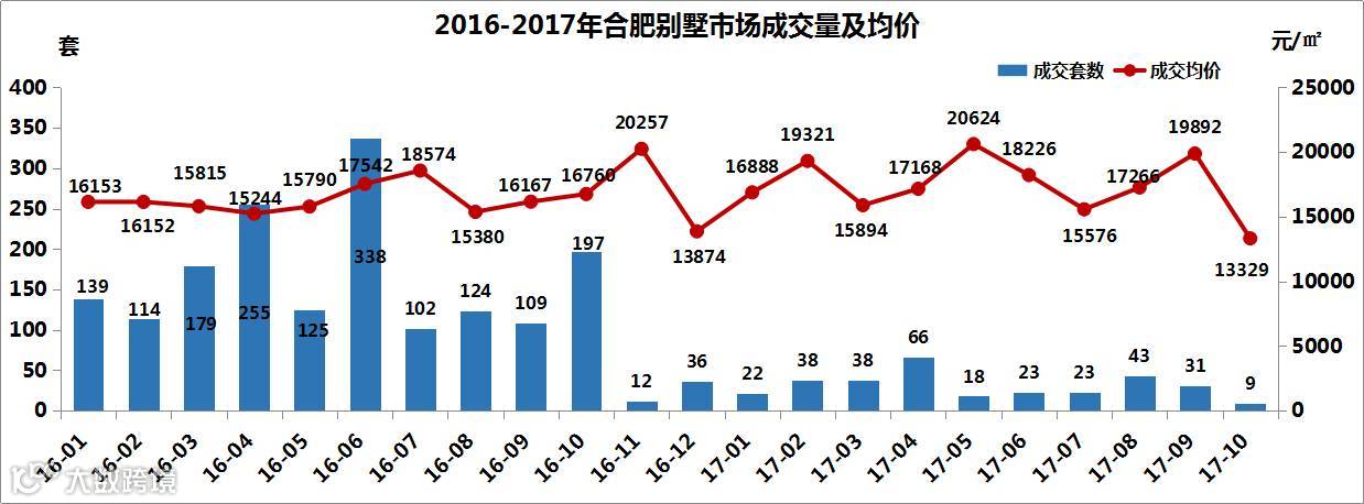 2011年-2016年,合肥的别墅市场成交量在逐年上涨,限购后期,进入到2017年,合肥的别墅市场成交量大幅下跌,今年1-10月合肥共成交别墅310套,仅是去年成交量的18%。