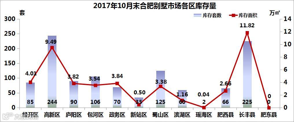 目前,高新区的别墅库存套数最高,为244套,而别墅库存面积最多的区域是长丰县,共计11.82万㎡,肥东县的别墅库存量为0。