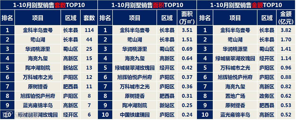 1-10月长丰县的金科半岛壹号以114套/3.51万㎡,3.82亿元的销量金额夺三料(销售套数、销售面积和销售金额)冠军;鹭山湖以44套/1.51万㎡,1.7亿元的销量金额夺销量排行榜亚军,蜀山区的华润桃源里排行第三,其成交金额为1.41亿元。
