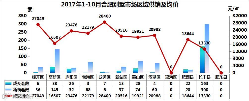 1-10月份,合肥别墅市场共计成交310套,销售面积10.33万㎡,成交金额18.12亿元,均价为17542.8元/㎡;供应量为778套/23.67万㎡,供销比为2.29,市场供大于求。